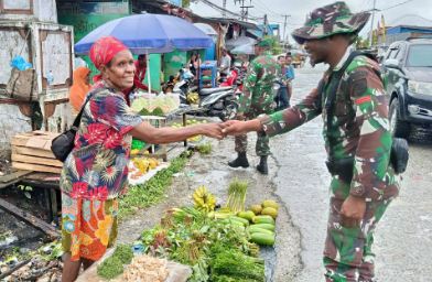 Anggota TNI yang tengah berpatroli, menunjukkan sikap humanisnya ketika bersalaman dengan seorang pedagang. Foto: Pendim 1710/Mimika.