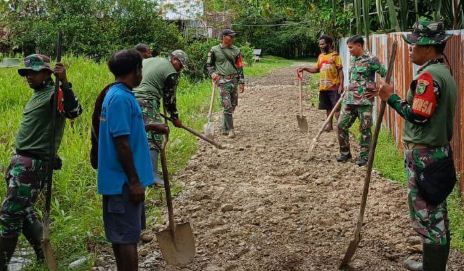 Mereka memperbaiki fasilitas umum jalan masuk menuju Kp. Jimbi, Distrik Kuala Kencana, Kabupaten Mimika, Papua Tengah, Kamis (25/9/2025). Foto: Pendim 1710/Mimika.