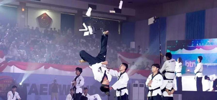 Taekwondoin memperagakan gerakan eksplosif saat melakukan demonstrasi pada acara pembukaan. Foto: Puspen TNI.