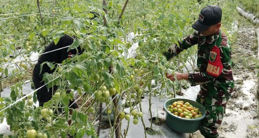 Sertu Tangkas Budiono sedang memanen komoditas tomat di ladang milik Bapak Wahyu. Foto: Pendim 1710/Mimika.Artikel ini sudah terbit di jurnal-idn.com