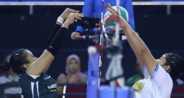 Pemain Bank Jatim (kiri) mengadu skill dengan atlet putri TNI AU Electric saat kedua tim beretmu. TNI AU akhirnya memenangkan duel dengan 3-2. Foto: Humas.