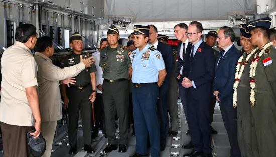 Presiden Republik Indonesia Prabowo Subianto didampingi Menhan dan Panglima TNI, menjelaskan keunggulan pesawat Airbus A-400M. Foto : BPMI Setpres.