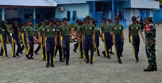 Siswa SMA Taruna Mimika mempraktekan gerakan yang diberi Sertu Tumpak Marpaung sebagai upaya menanamkan disiplin dan kekompakan sejak dini. Foto: Pendim 1710/Mimika.