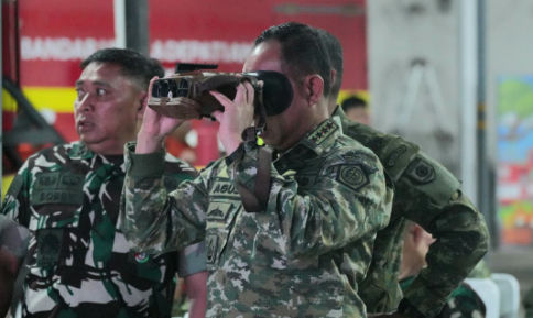 Panglima TNI Jenderal TNI Agus Subiyanto menggunakan teeropong untuk memantau latihan terjun malam KDOL dari Denmatra 1 dan Brigif Para Raider 18/Trisula di Bangka. Foto: Puspen TNI.