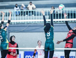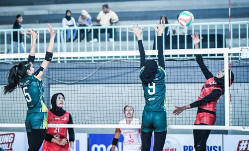 Pemain Tornado Jakarta melakukan spike, namun digagalkan atlet Putri Bank Jatim. Foto: Humas.