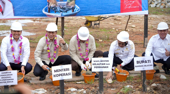DESA TUKAK, gen-idn.com – Menteri Koperasi (Menkop) Ferry Juliantono menandatangani kerjasama dengan Kementerian Kelautan dan Perikanan (KKP) terkait pengembangan koperasi modern di kawasan Kampung Nelayan di Desa Tukak, Bangka Selatan, Jumat (19/12/2025). Juga dilakukan peletakan batu pertama (groundbreaking) pembangunan SPBU Nelayan dan Gerai, Gudang serta Sarana Pendukung lain Koperasi Desa/Kelurahan Merah Putih (KDKMP) di Desa Tukak, Bangka Belitung.