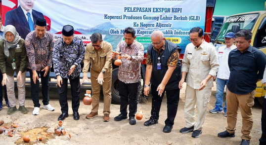 SUBANG, gen-idn.com – Menteri Koperasi (Menkop) Ferry Juliantono melepas ekspor kopi ke Aljazair hasil Koperasi Produsen Gunung Luhur Berkah (GLB) sebanyak 5 kontainer atau volumenya mencapai 96 ton di Kampung Leuwinutug, Cisalak, Kabupaten Subang, Jawa Barat, pada Sabtu (17/1/206).