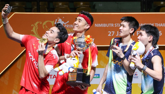 Leo Rolly Carnando mengajak rekannya Bagas Maulana dan runner up Raymond Indra/Nikolaus Joaquin foto selfi. Foto: Humas.