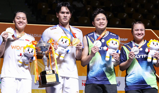 Pasangan Adnan Maulana/Indah Cahya Sari Jamil bersama rekannya Bobby Setiabudi/Melati Daeva Oktavianti. Foto: Humas.