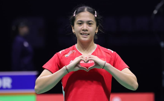 Senyum kemenangan dan tanda cinta dari pebulutangkis Ni Kadek Dhinda Amartya Pratiwi. Foto: Humas.