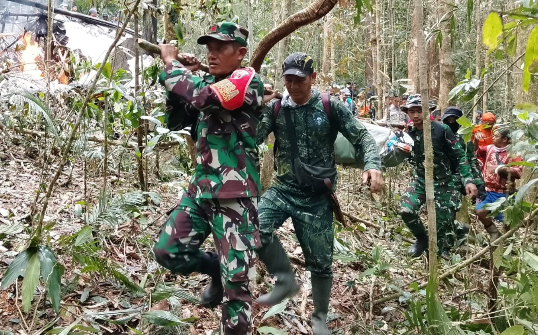 Tim Satgas Pengamanan Perbatasan RI–Malaysia Yonarmed 4/Prh dan unsur Komando Distrik Militer Nunukan, membawa jenazah pilot dengan tandu darurat. Foto: Puspen TNI.