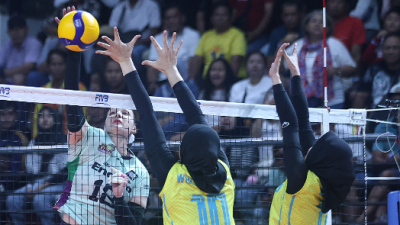 Satu pukulan keras pemain Surabaya Samator yang gagal diblok atlet Jakarta Bhayangkara Presisi, namun Samator takluk 0-3 dari tim Bhayangkara. Foto: Humas.