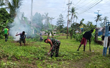 Babinsa Koramil 1710-07/Mapurujaya Ajak Warga Gotong Royong Bersihkan Halaman Gereja